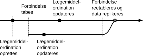 En lægemiddelordination oprettes. På et tidspunkt tabes forbindelse mellem to FMK instanser. På begge instanser opdateres lægemiddelordinationen. Herefter reetableres forbindelsen og data replikeres. Når der herefter slås på på FMK vil der optræde en ny version, der er resultatet af de to opdateringer. Afhængigt af hvordan lægemiddelordinationen er opdateret vil indholdet være enten den seneste opdatering (“last wins”) eller en foreningsmængde heraf (f.eks. hvis der samtidigt er registreret effektueringer). Den nye version vil have to PreviousVersion-elementer.