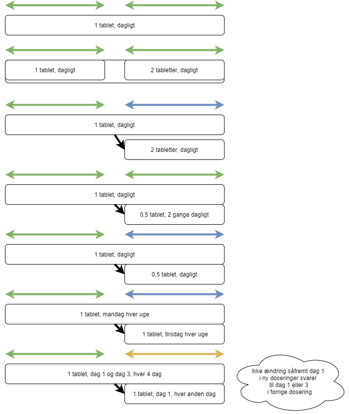 - Eksempel viser at der i forrige periode var planlagt 1 tablet dagligt i den nye periode, da den forrige blev pakket, men dette har ændret sig i mellemtiden, og den nye dosering har ikke samme daglige dosis som den forrige. Dette ses som en dosis-ændring og vil blive markeret i ændringsloggen.