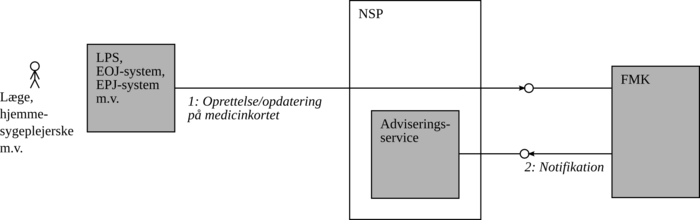 - EOJ-systemet vil efter en filtrering og aggregering af adviseringer kunne præsenteres brugeren med information omkring at der er foretaget opdateringer på borgerens medicinkortet, ved behov også information omkring hvilke typer af opdateringer. Hvornår og på hvilken måde dette præsenteres afhænger af brugerens rolle og arbejdsgangene i øvrigt. Eksempelvis vil det sandsynligvis virke forstyrrende såfremt alle brugere uanset rolle præsenteres for denne information, eller at der ikke foretages en aggregering (idet hver separate handling på medicinkortet vil medføre en separat advisering). En advisering om en oprettelse eller opdatering på medicinkortet (eller et aggregeret sæt af adviseringer) bør altid medføre at der efterfølgende slås op på FMK, eksempelvis at medicinkortet hentes.