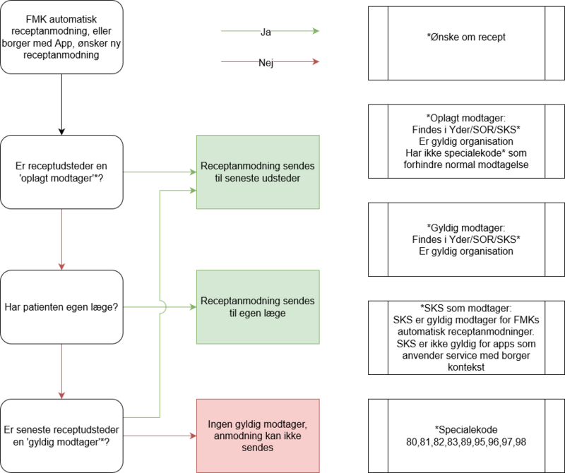 (Bemærk: Har patienten ikke en egen læge, eller kan denne ikke bestemmes, vil receptanmodningen falde tilbage til at blive sendt til udstedende læge, såfremt dennes organisation er gyldig. Er organisationen ikke gyldig, sendes ingen anmodning, da der ikke kan findes en gyldig modtager)