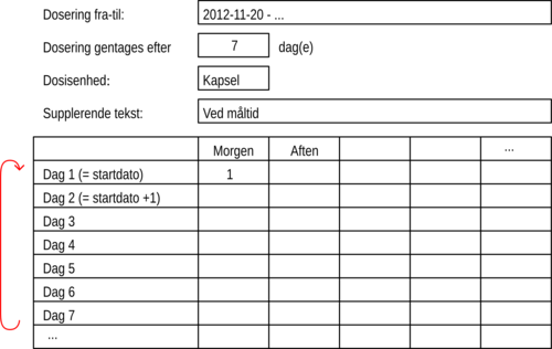 Bemærk at doseringens starttidspunkt definerer hvilken dag der angives som dag 1. I ovenstående eksempel er dag 1 tirsdag den 20. november 2012. Dag 1 er således ikke nødvendigvis en mandag, heller ikke for en dosering der gentages ugentligt. Præsentationen i det lokale system kan dog være anderledes, hvis det lokale medicinskema er indrettet således at dag 1 altid er en mandag.