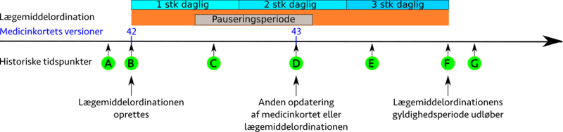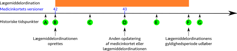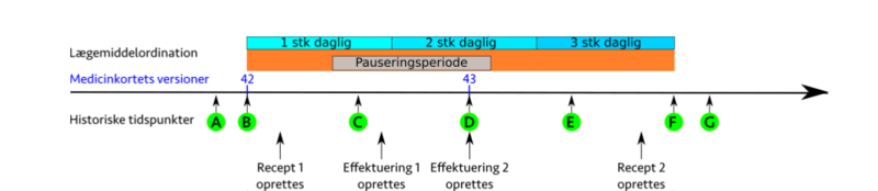 På ovenstående figur illustreres de forholdene omkring opslag med versionsnummer og tidspunkt. En lægemiddelordination oprettes, herved får medicinkortet versionen 42. Der sker en anden opdatering til version 43, og på et tidspunkt inden der opdateres til version 44 seponeres lægemiddelordinationen idet gyldighedsperionen udløber.